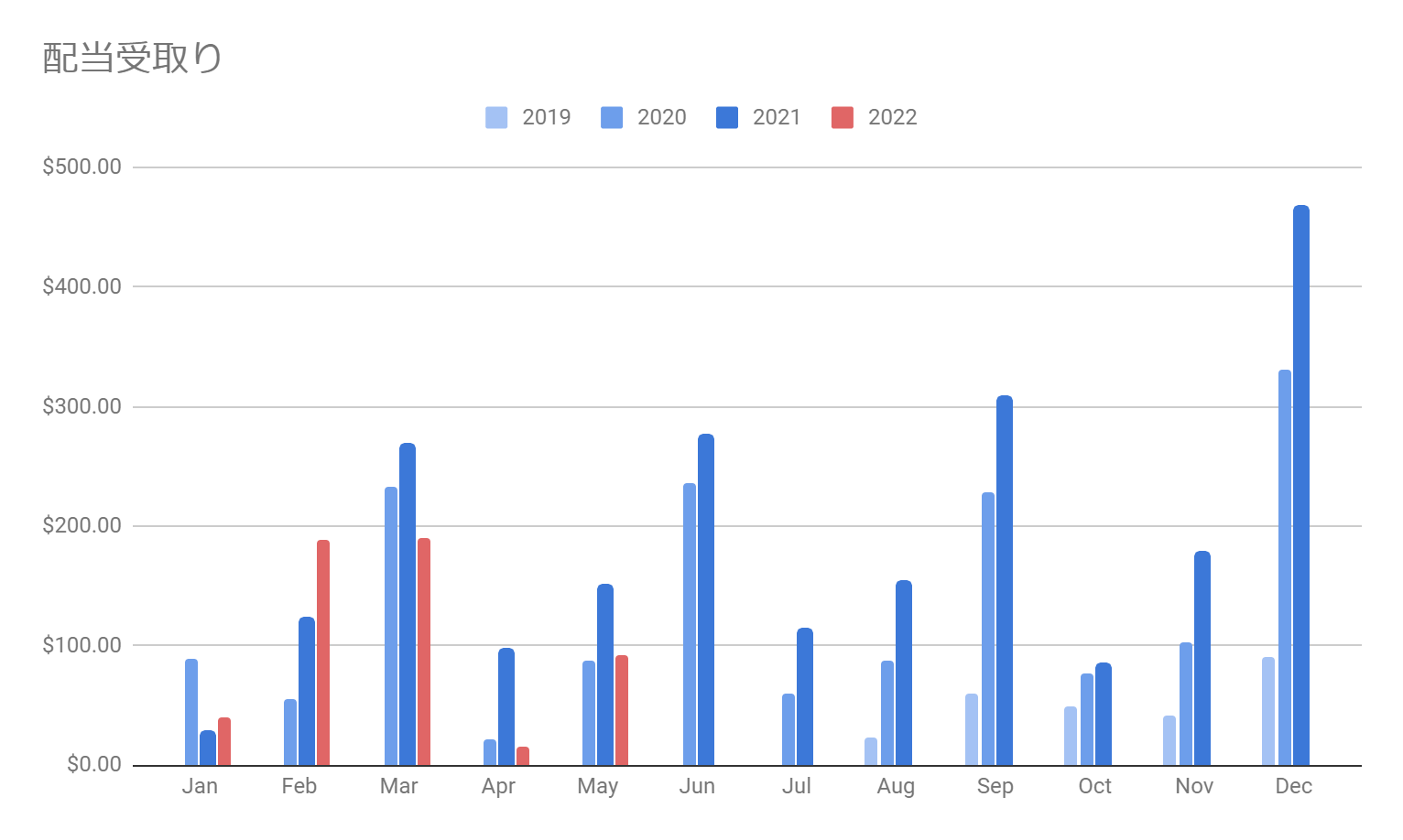今月の配当金は、日本円換算で約21,762円でした。去年は約13,000円程でしたので、8千円程アップしました。