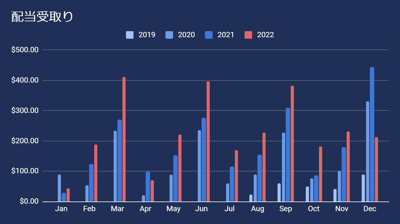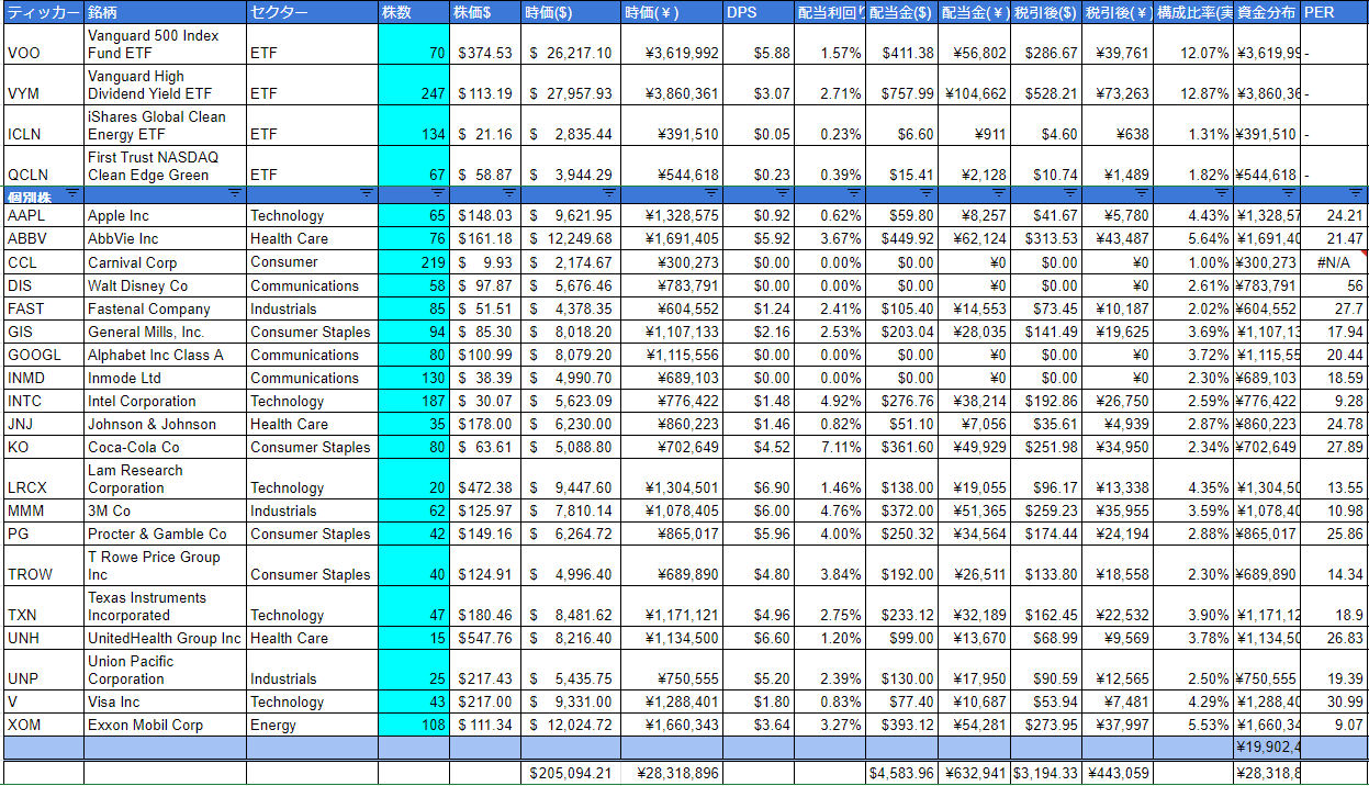 今月の配当金は、日本円換算で約32,000円でした。去年は約20,000円程でしたので、1万2千円程増加しました。ポートフォリオの実力ではなく、為替変動による影響が大きいです。