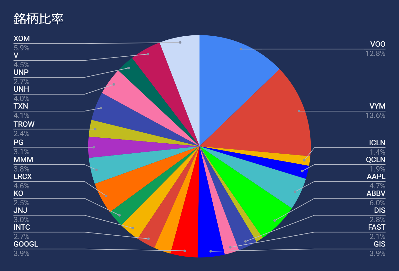 ポートフォリオの配当利回りは、2.24%(先月2.32%)になります。税引き後では、1.56%(先月1.62%)でした。
