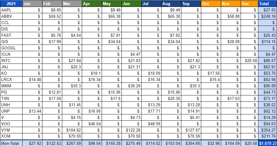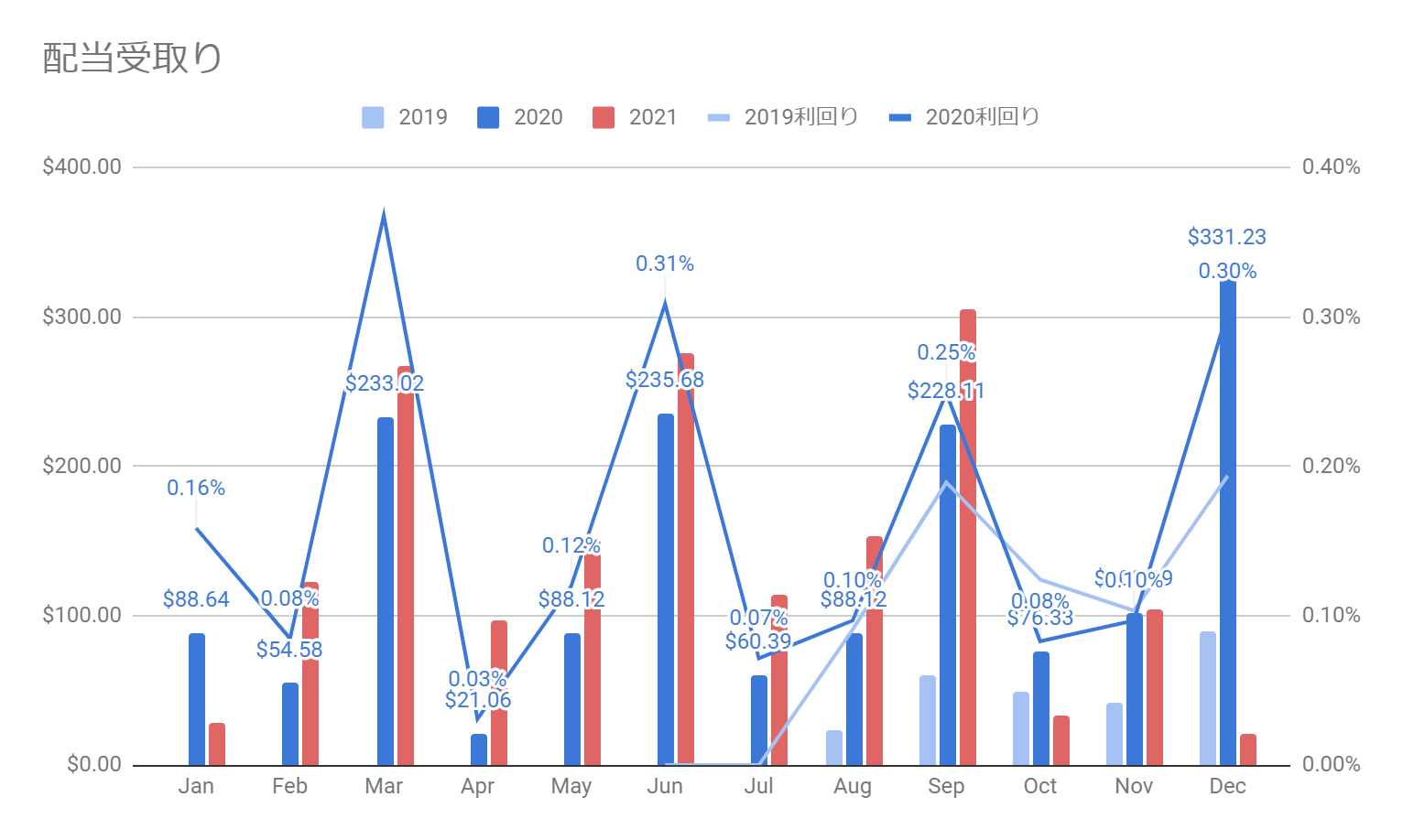 今月の配当金は、日本円換算で約34,000円でした。ちょうど1年前の受け取り配当は、銘柄は同じで24,000円でしたので、増配と保有株数の増加で1万円増えています。
