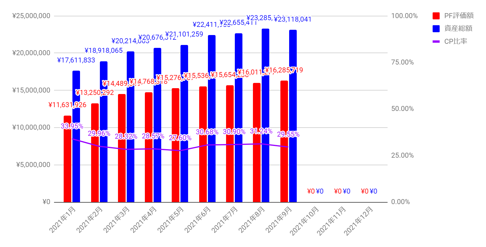 全体資産は前月比約-0.72%減少しました。PF評価額(赤)が増加しているのは、40万の買い付けによるものです。その反面、キャッシュポジションが下がり、PFが伸びなかったため、全体の資産総額は減少になっています。