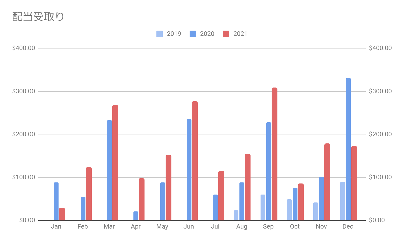 今月の配当金は、日本円換算で約20,000円でした。ちょうど1年前の受け取り配当は、銘柄は同じで10,600円でしたので、倍増しました。